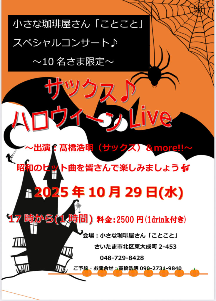 10月29日は、我が自治会内にある小さな珈琲屋さん「ことこと」でハロウィンコンサートを開催しました。