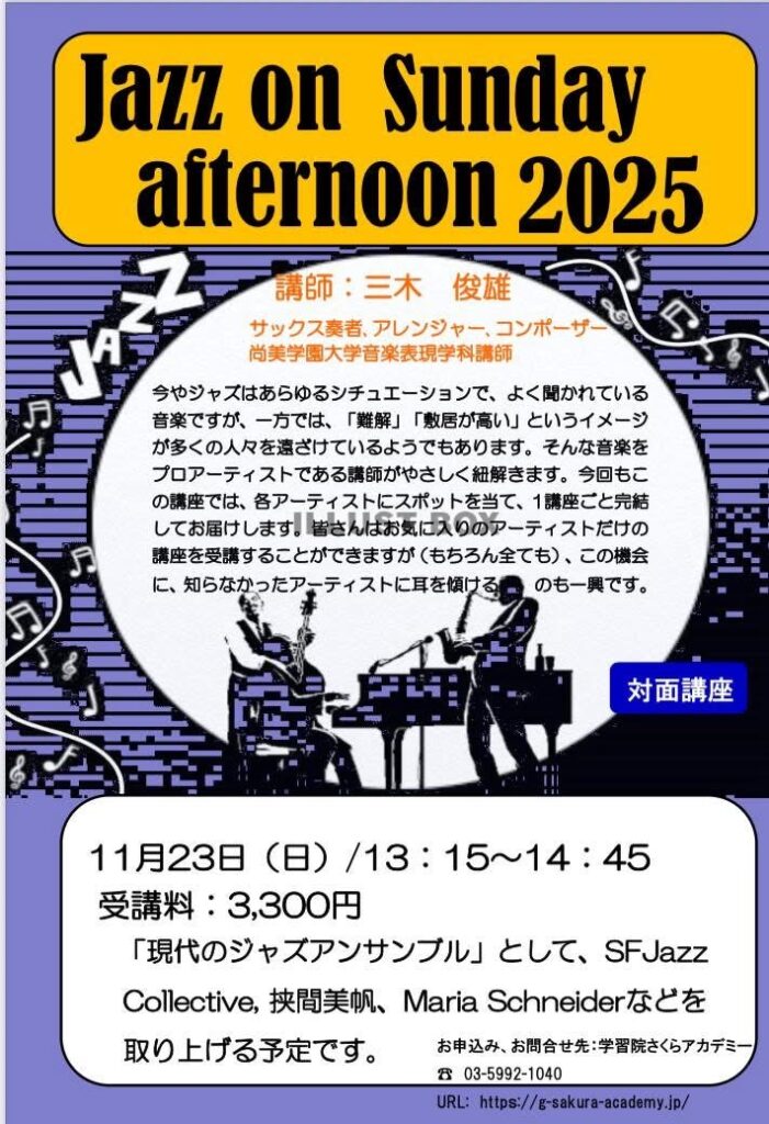 現在、私がサックスの指導を受けている「三木俊雄講師」による、今回の内容は「ジャズアンサンブル」について。