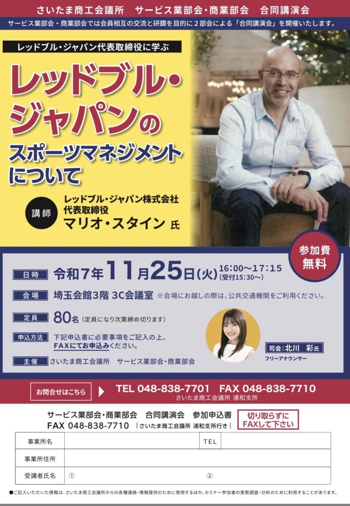 そのような環境の変化の中で、私が所属する「さいたま商工会議所」で、11月25日にレッドブル・ジャパン株式会社 代表取締役「マリオ・スタイン氏」の講演会があることを知り、早速、浦和駅から程近い「浦和会館」に向かいました。