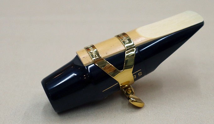 これを、写真左側にあるマウスピースに装着して、「リガチャー」という締金でリードを固定。