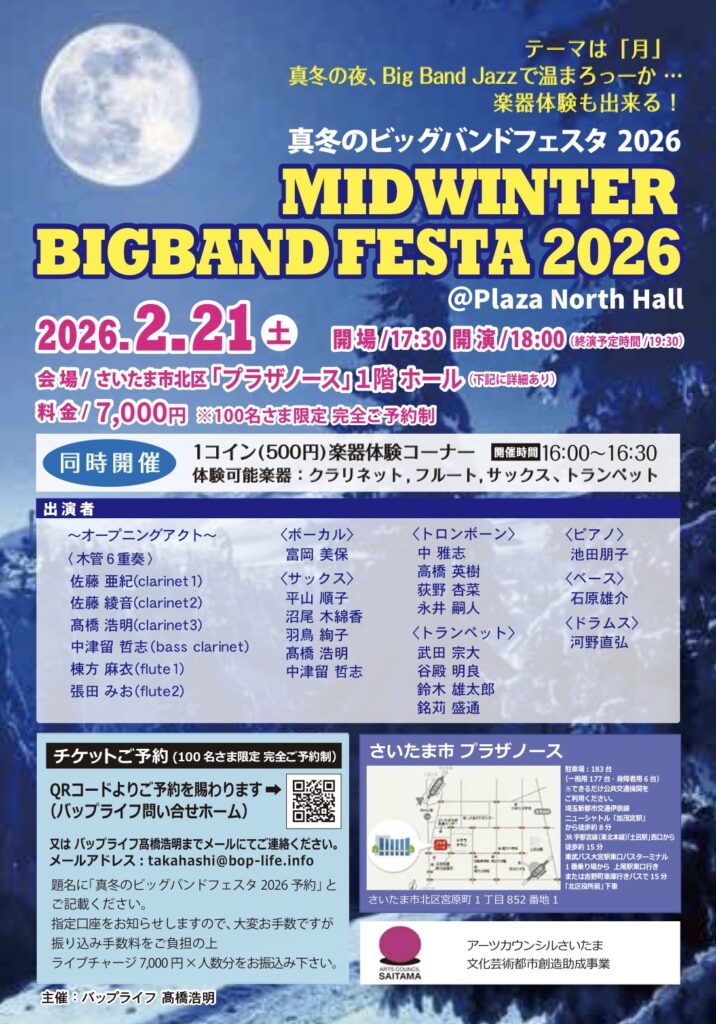 今年度最大のバップライフの主催コンサート♪ 「真冬のビッグバンドフェスタ2026」が2月21日(土)プラザノースホールで開催されます。