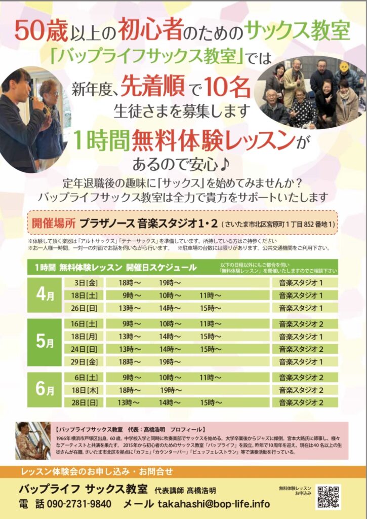 当教室「バップライフサックス教室」は、定年退職後の趣味としてサックスをお勧めし、その数年前から練習を開始する事で、「より楽しいセカンドライフのお手伝い」を、推進しています。