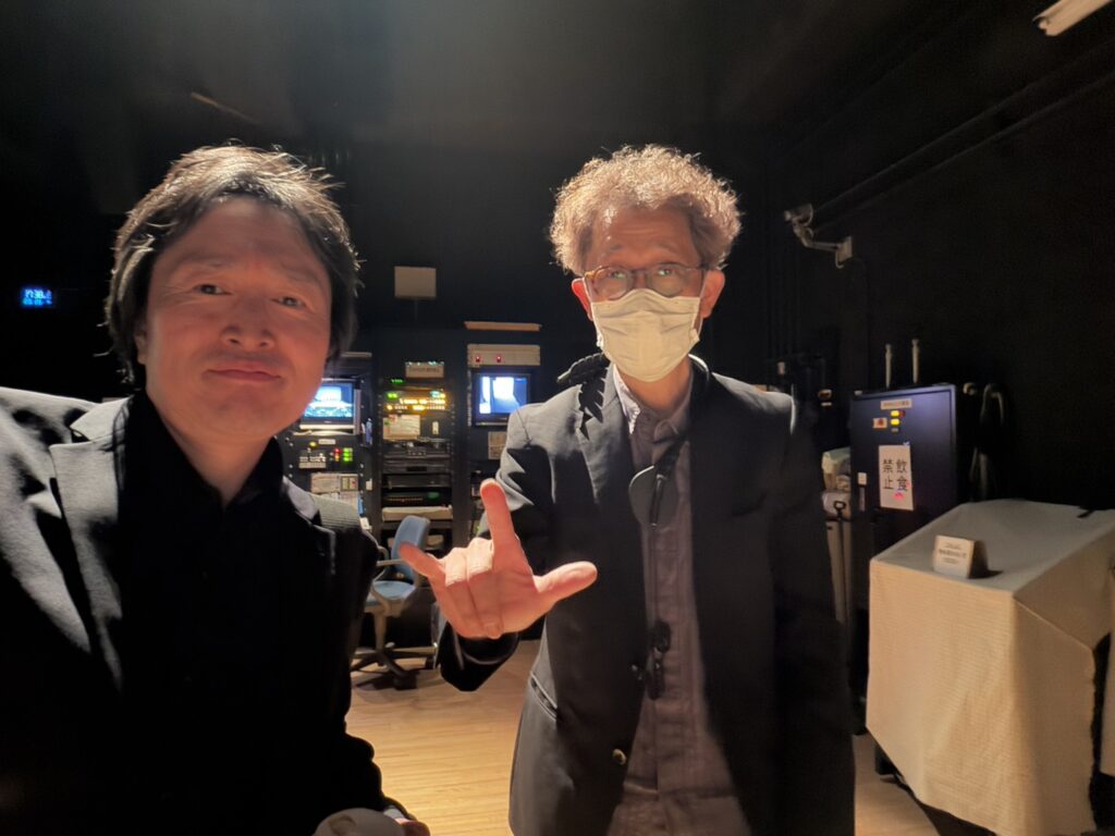 開場時間になり、続々とお客様がいらっしゃる頃、上手で、ドラムスの河野直弘さんと、つかの間の談笑。