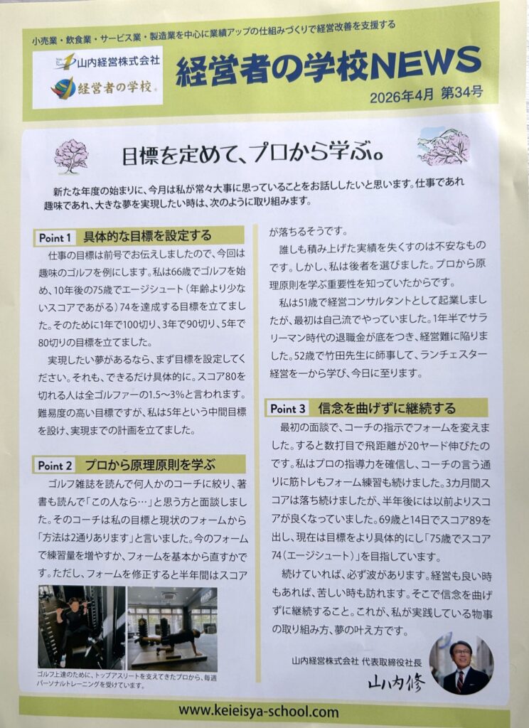 その方法として山内社長は定期的に「経営者の学校NEWS(ニュースレター)」を発行されていて、私の元にも定期的に郵送してくださいます。